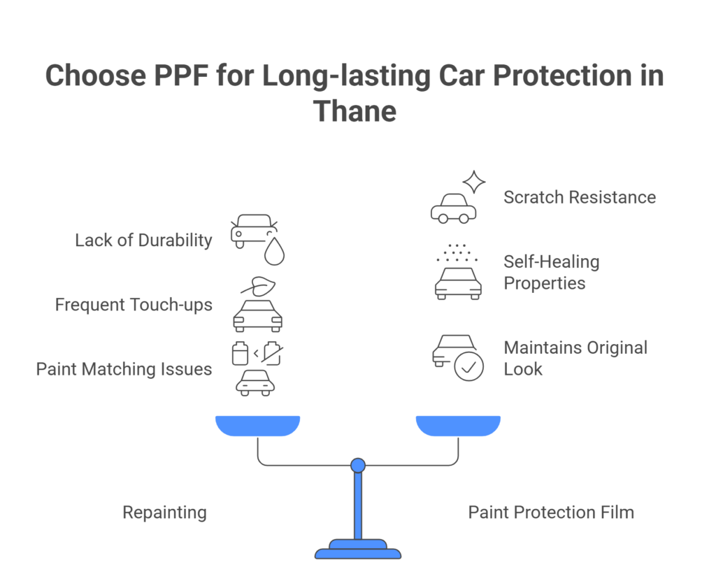 When compared to repainting, Paint Protection Film (PPF) offers unmatched durability, making it the perfect solution for Thane car owners. Here’s why: